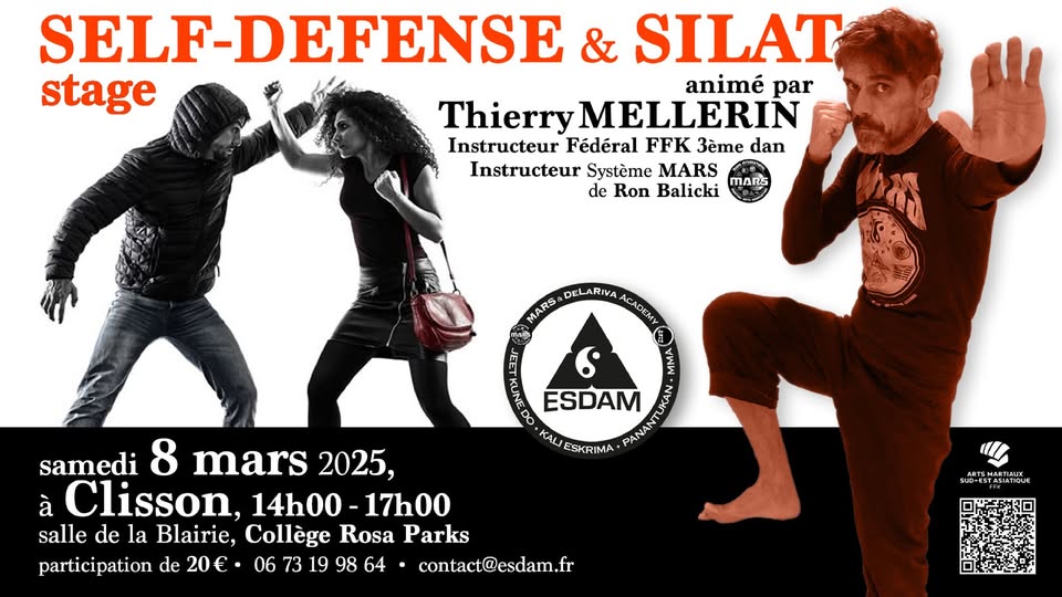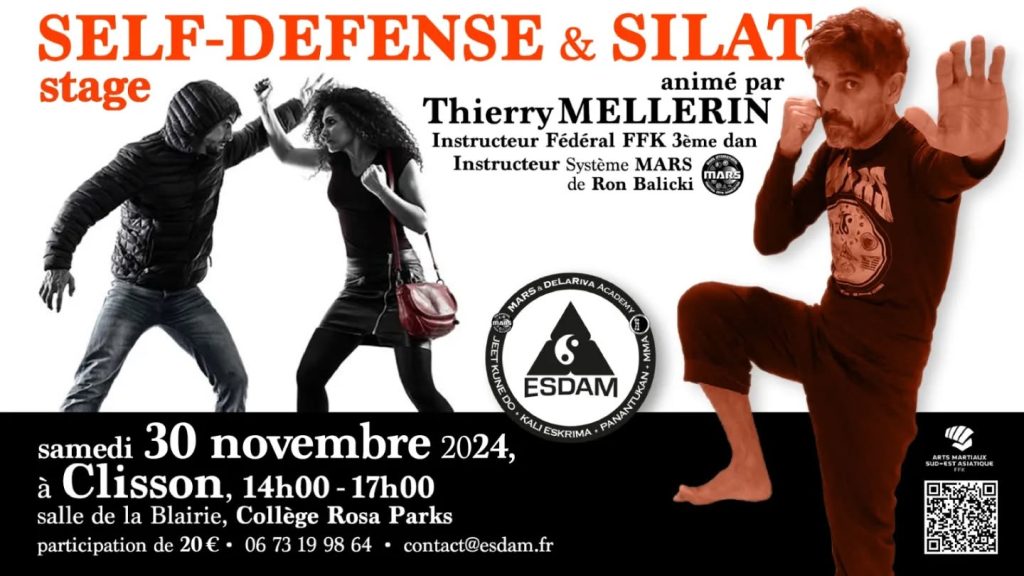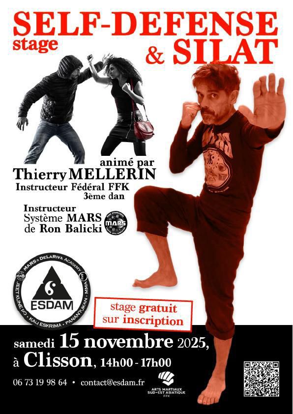 Bonjour à toutes et à tous. Si vous êtes dispos et motivés, l’ESDAM vous propose un stage gratuit de Self-Defense / Silat, le samedi 15 novembre entre 14h00 et 17h00, dans notre salle habituelle. Ce stage est ouvert à toutes et à tous. Les places seront limitées donc merci de vous y inscrire par avance